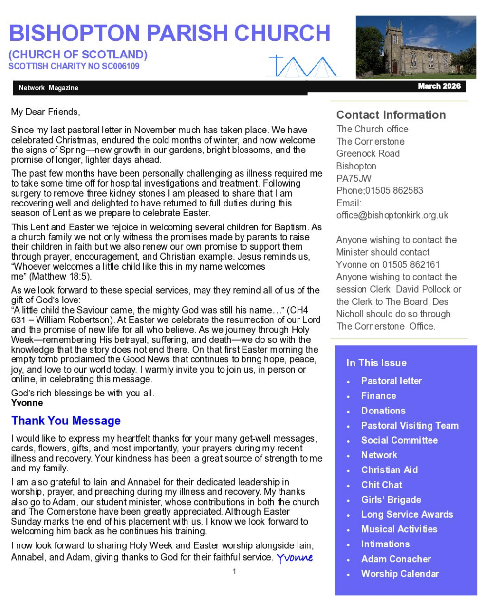 Keep up to date with what's on in Bishopton Parish Church!